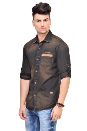Casual blue denim washed shirt from Gesture Jeans, made of cotton denim, which offer good strength and lasting quality. With a focus on key styles and shapes that every man needs in his wardrobe, It has a regular collar with suede fabric detail, full button placket, single chest pocket with red piping, full sleeves with Roll-Up Tab feature, curved hem.